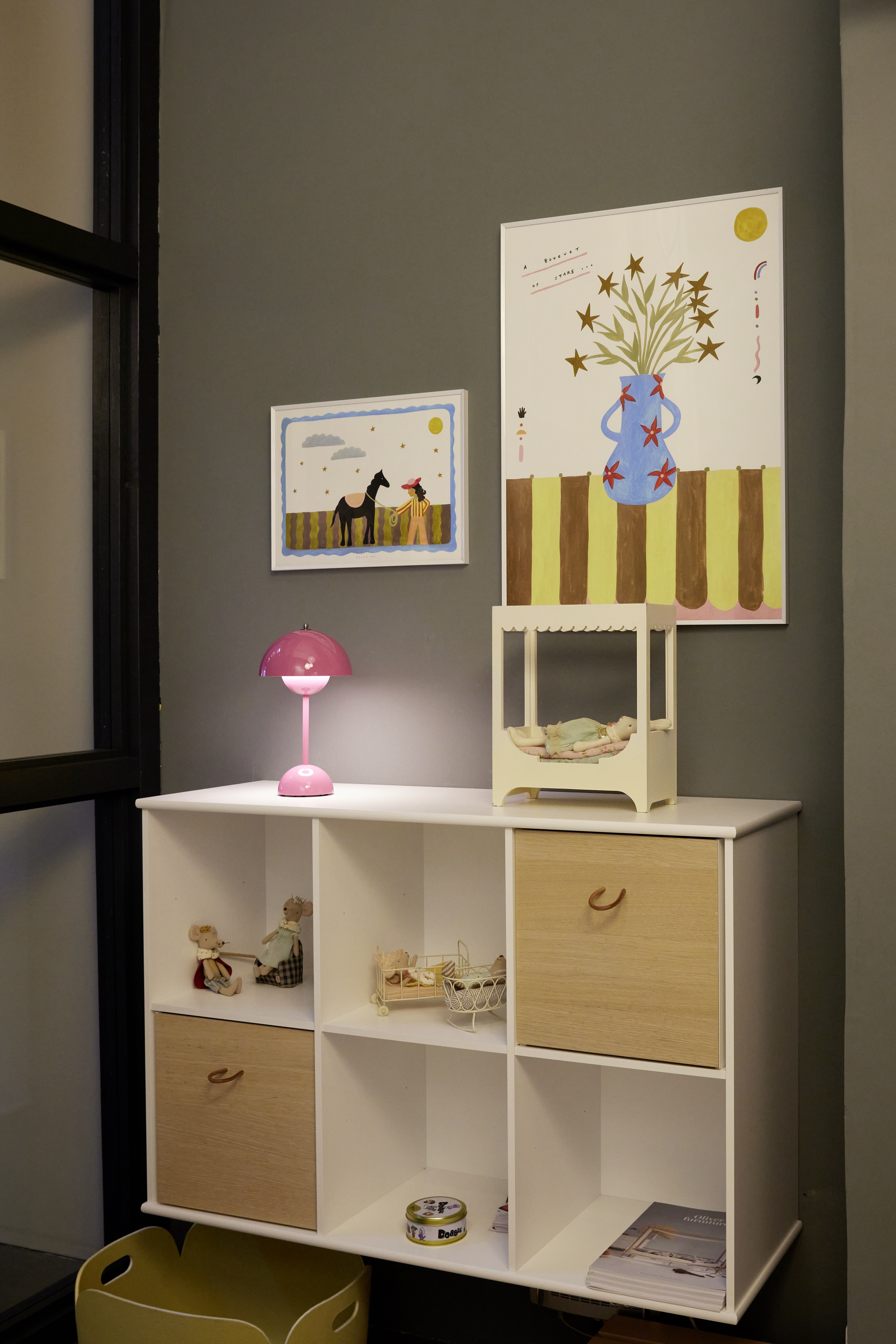 Kinder sind herzlich Willkommen. Das Wandregal ist von Oliver Furniture.